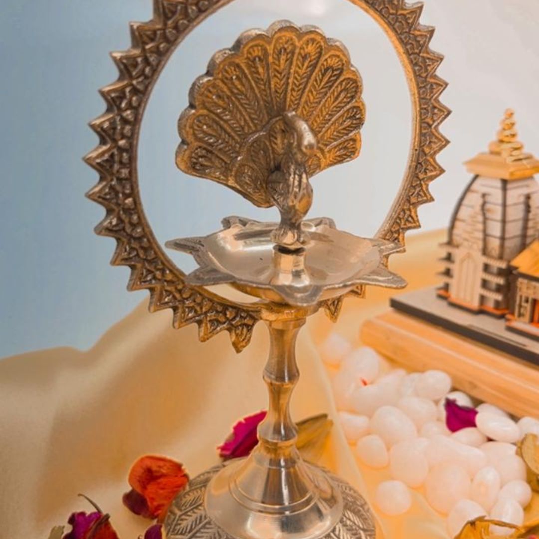 - About Product: Beautiful Brass Peacock Diya with Crown. Diyas are integral custom or tradition to start all the auspicious events by lighting the lamp to create a spiritual atmosphere.
